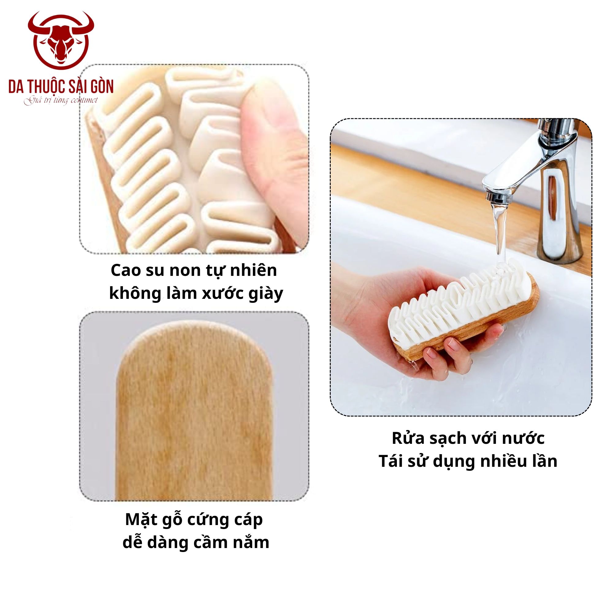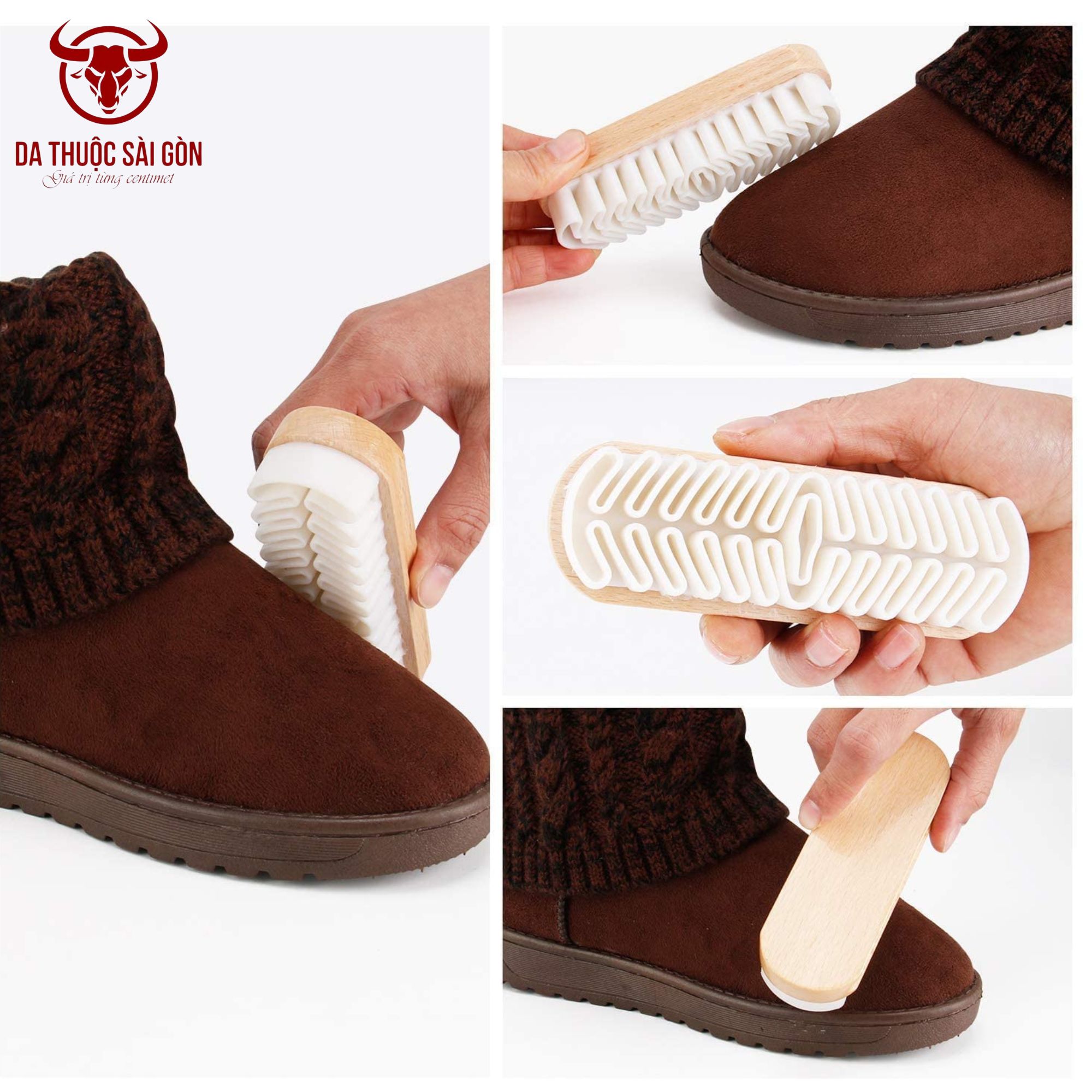 - Chải khô: Dành cho những vết bẩn thông thường như bụi bẩn hoặc vết bùn chưa khô, bạn chỉ cần dùng bàn chải da lộn và chải nhẹ nhàng theo một chiều. Bàn chải cao su non sẽ cuốn theo bụi bẩn mà không làm xước lớp da.